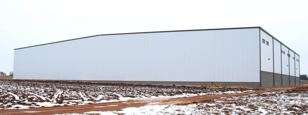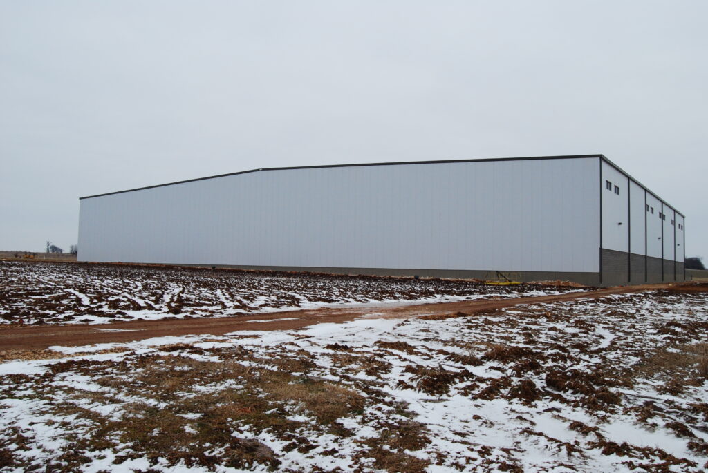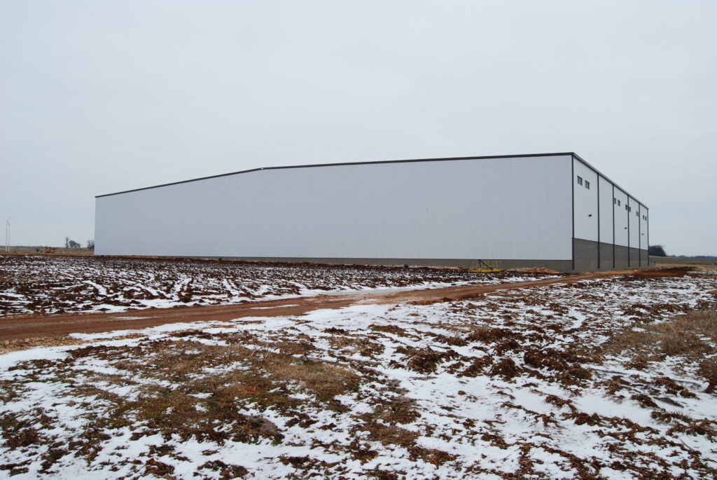 This pre-engineered facility includes 40’ x 100’ bay spacing, 38’-0” eve heights, bar joist roof framing, standing seam metal roof system, 6” R-19 roof insulation, 2” insulated wall panels, 8’ masonry wainscot on three sides with one expendable end wall. The facility also includes 3’ x 9’ anodized aluminum store front windows, two 9’ x 9’ dock doors, one 14’ x 16’ vertical lift door, and stone prepped for future 8” concrete slab.