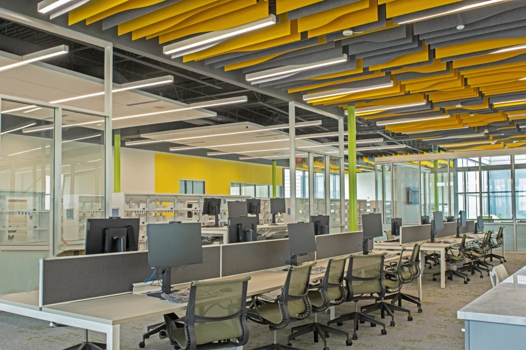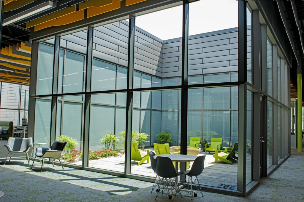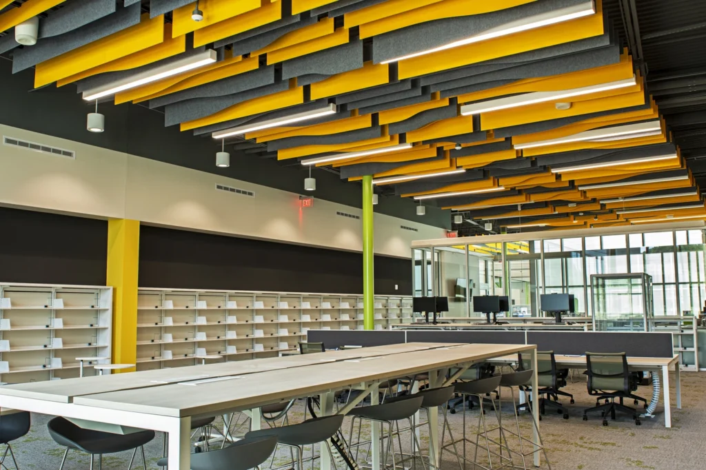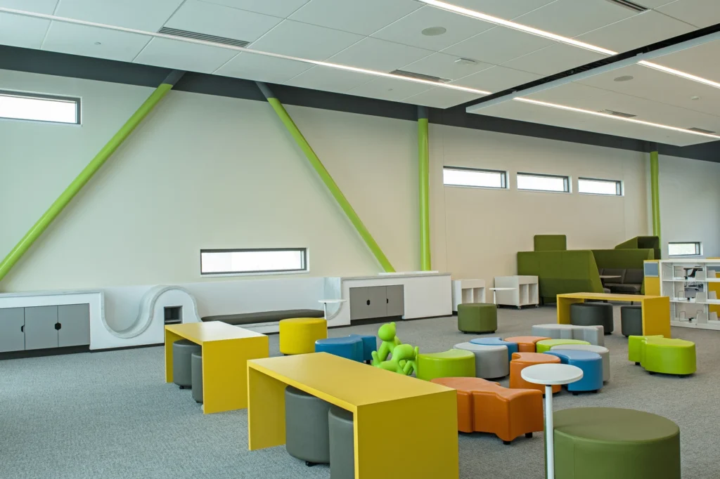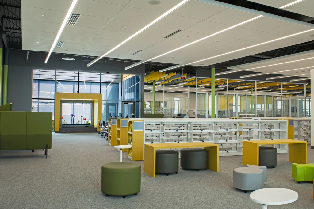 Bullitt County Public Library new facility features open areas, multi meeting conference rooms, geothermal systems, solar panels lighting controls, recording of energy use and savings. Framing for the building is structural steel. The exterior was a mixture of brick, metal panels and curtain walls.