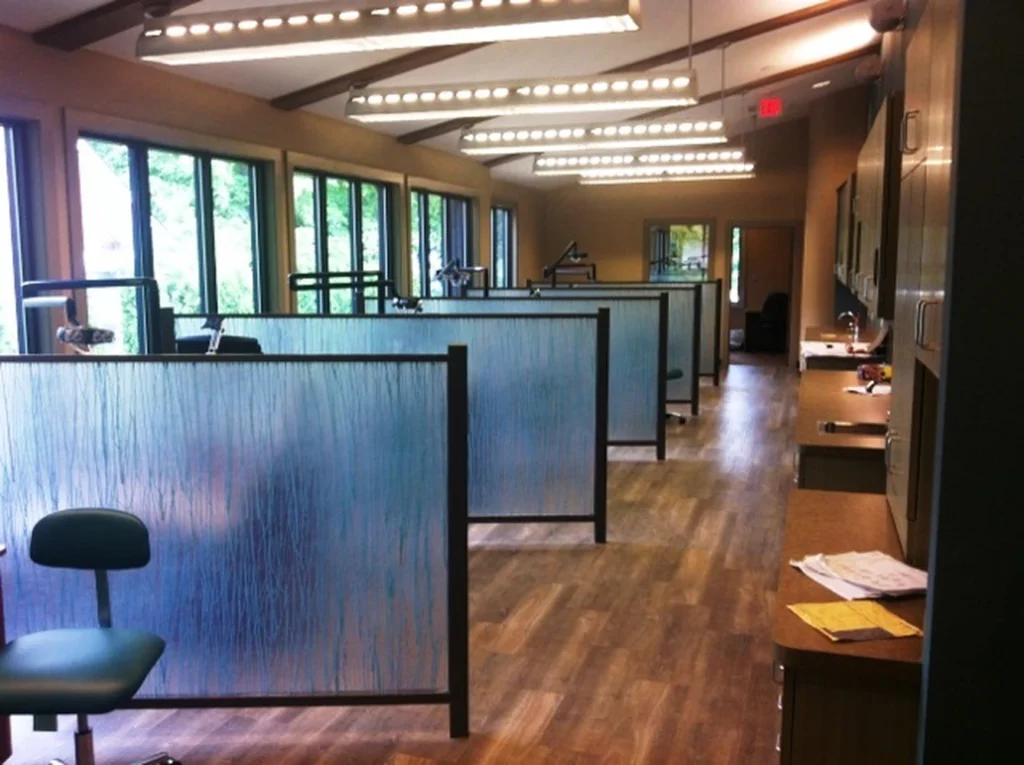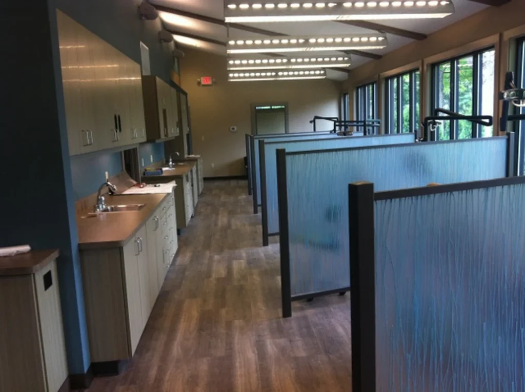 orthopedic exam chairs. Not to mention x-ray, consolation areas, teeth brushing counter, lab, sterilization room and offices.