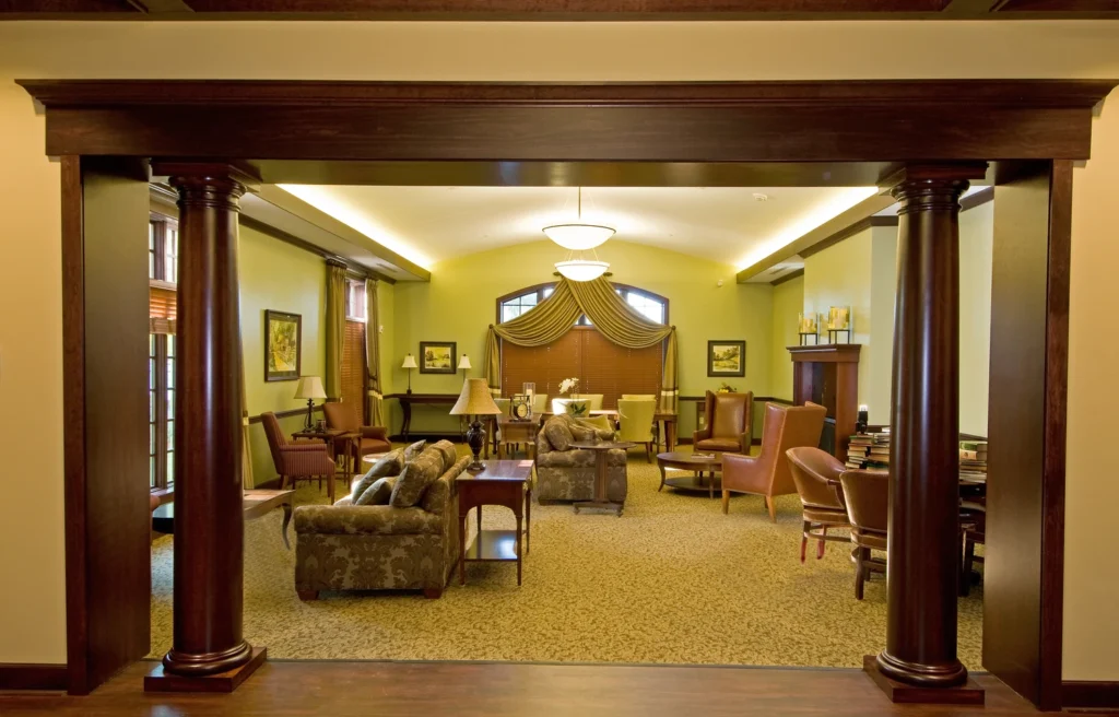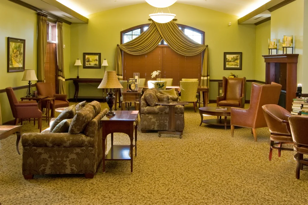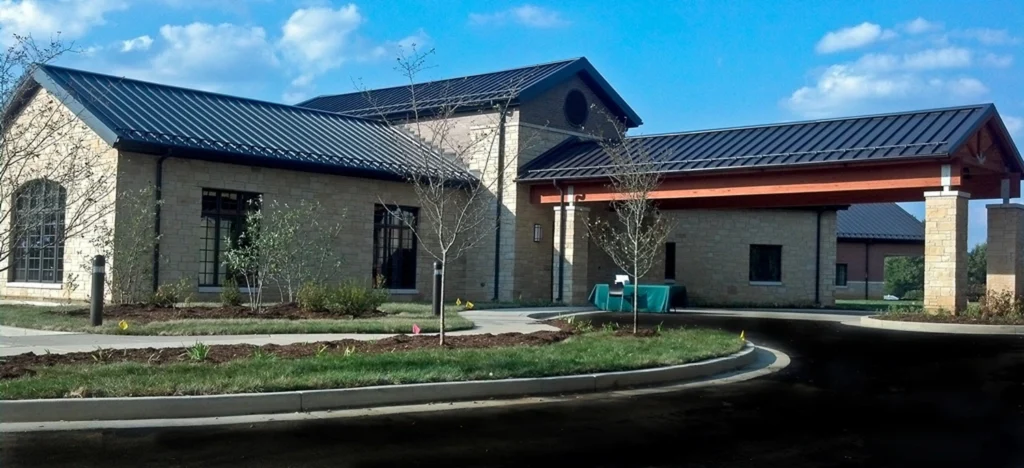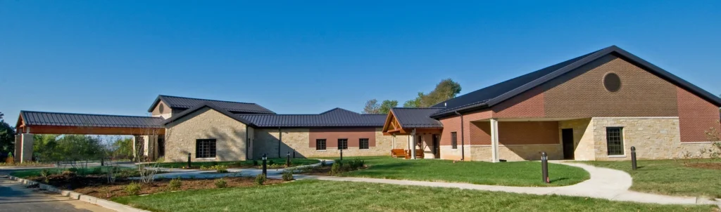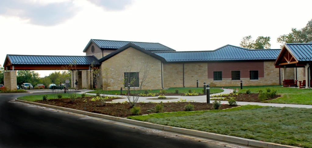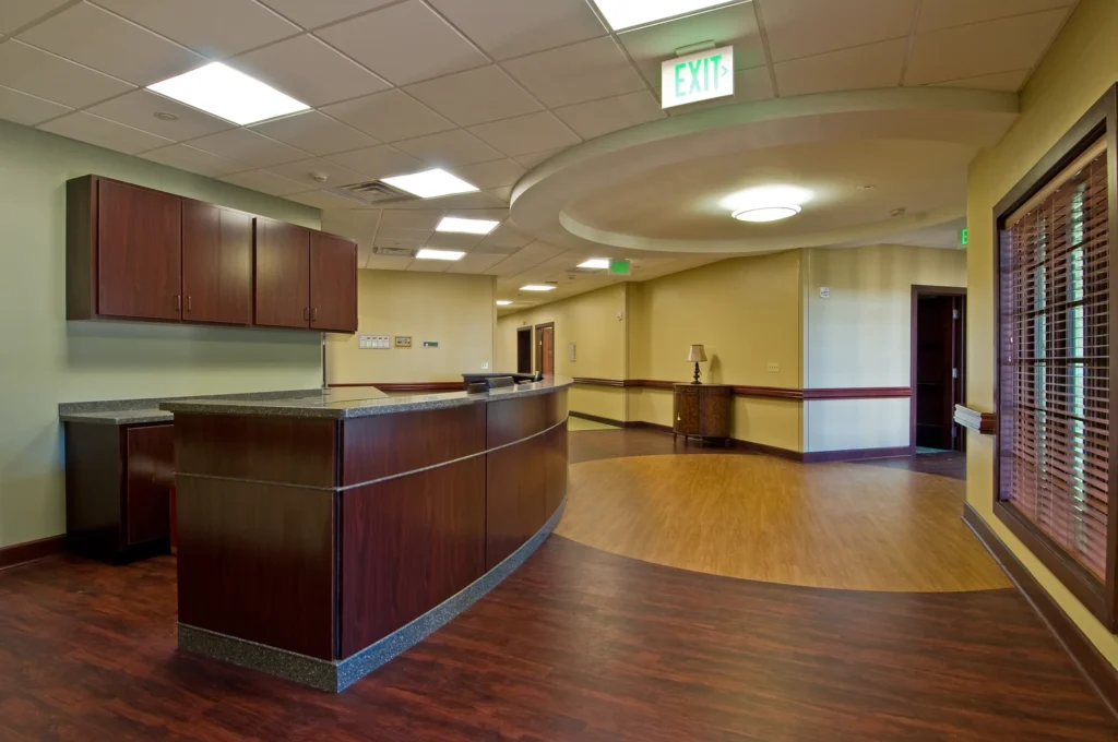 The new Hospice inpatient unit including, great room, administrative offices, laundry, full service kitchen, family room and (12) patient rooms with private restrooms and individual covered porches, including a double room.  Facility is located on approximately 11 acres with a pond and walking trail.