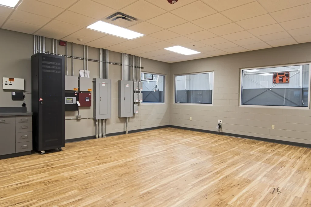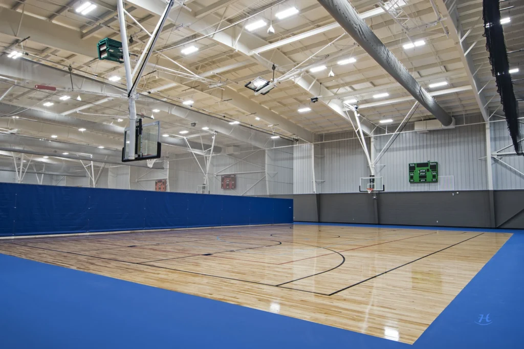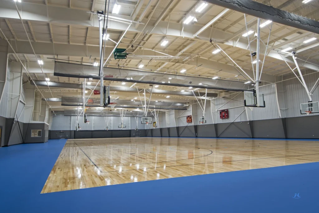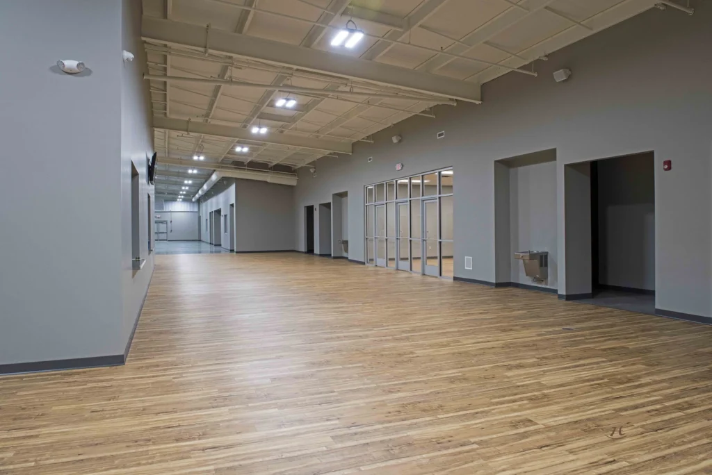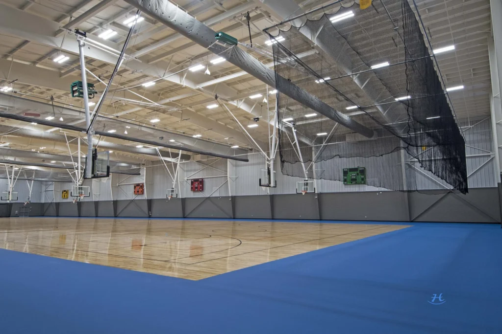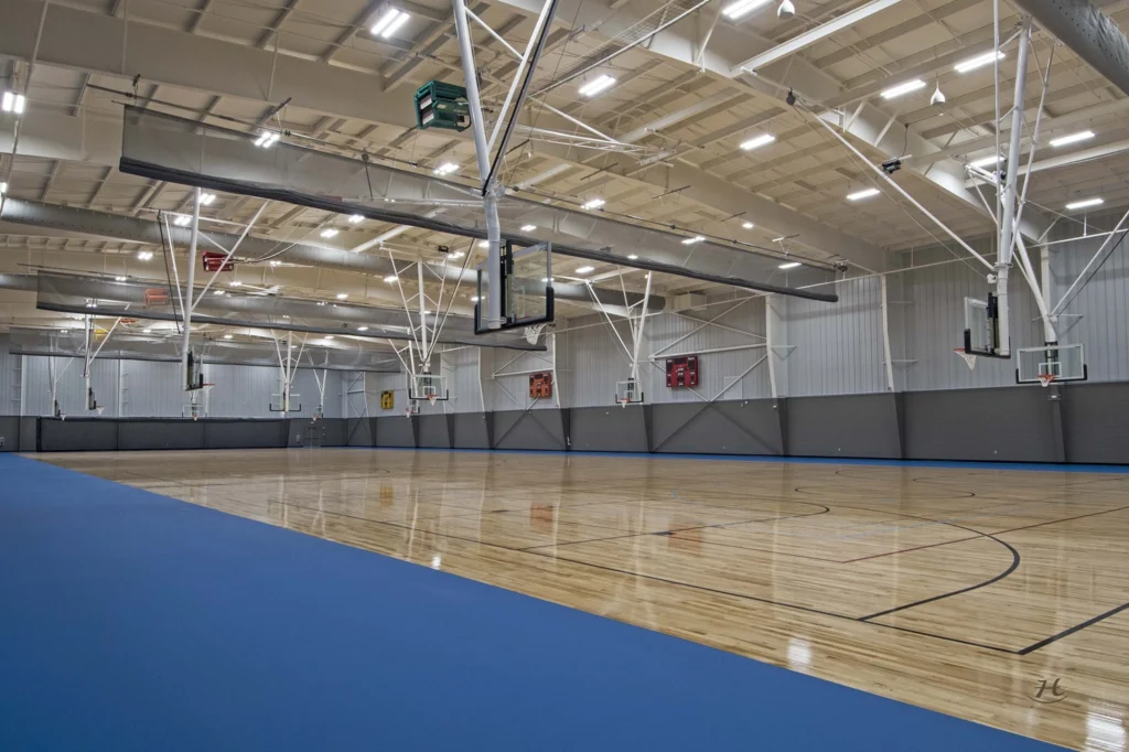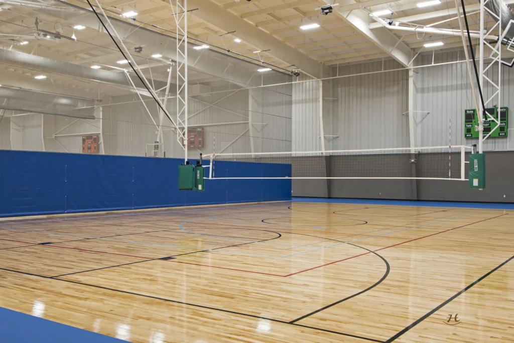 Michael O Buchanon Park’s new gymnasium features four middle school courts, two high school courts, four indoor volleyball courts with nets that lower from the ceiling, two indoor batting cages that lower from the ceiling, and three meeting room facilities available for public use.